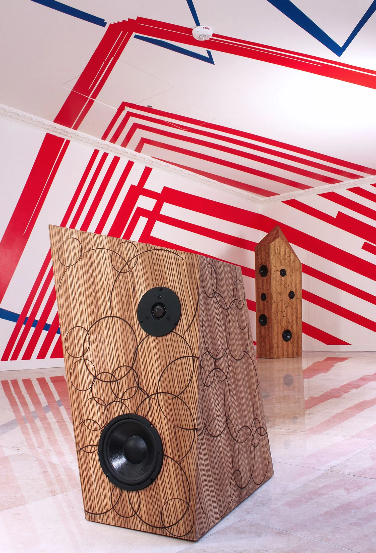 An installation of seven Zebrano heat-stamped speakers playing original ambient music composed by Kaia Fischer, Sebastien Leon, and various artists from Brooklyn-based label End Up.