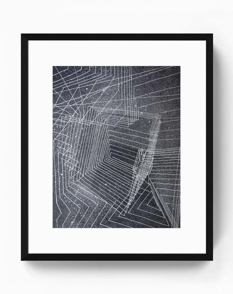 Sébastien Léon’s abstract paintings extend his practice as a sculptor and sound artist. Each work begins with a three-dimensional digital sculpture projected onto a wood panel. The architectural lines of the model form a geometric framework, guiding Léon as he applies strips of tape to define negative space before painting begins.